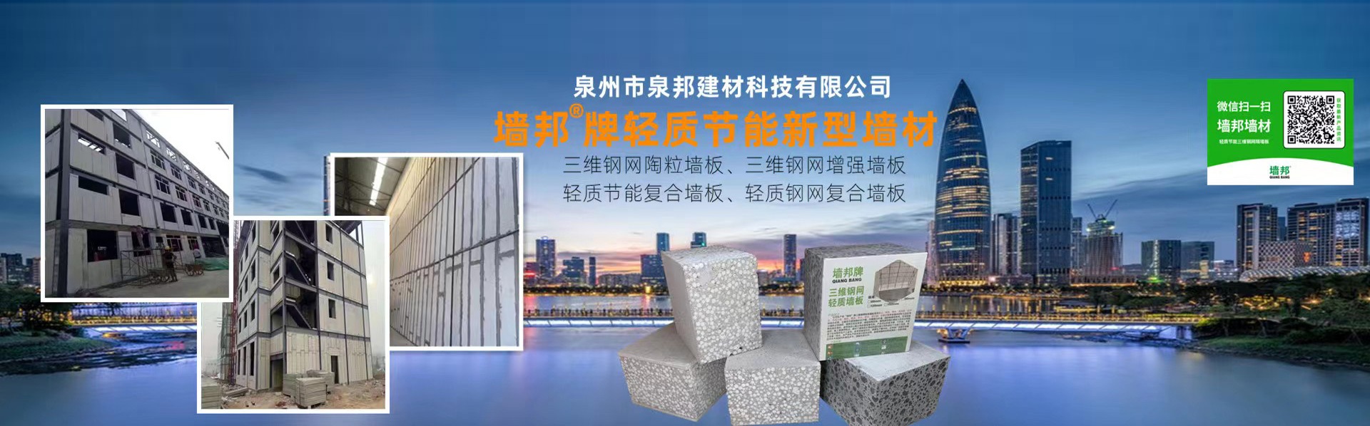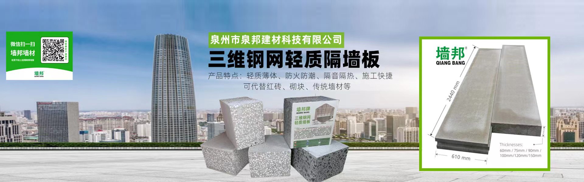 ??泉州市泉邦建材科技有限公司是“墻邦” (QIANGBANG)品牌所有者,是目前國內專業的墻材供應商之一。泉邦建材墻板生產設備技術國內排名靠前、較大的提高了生產效率、大幅降低了勞動強度;實現了住宅部件生產工業化、技術裝備現代化、規模生產集約化、應用推廣法制化和施工裝備一體化。墻邦墻板生產技術的引進及應用,是我國墻體材料改革的一項新突破,技術水平居國內外水平。